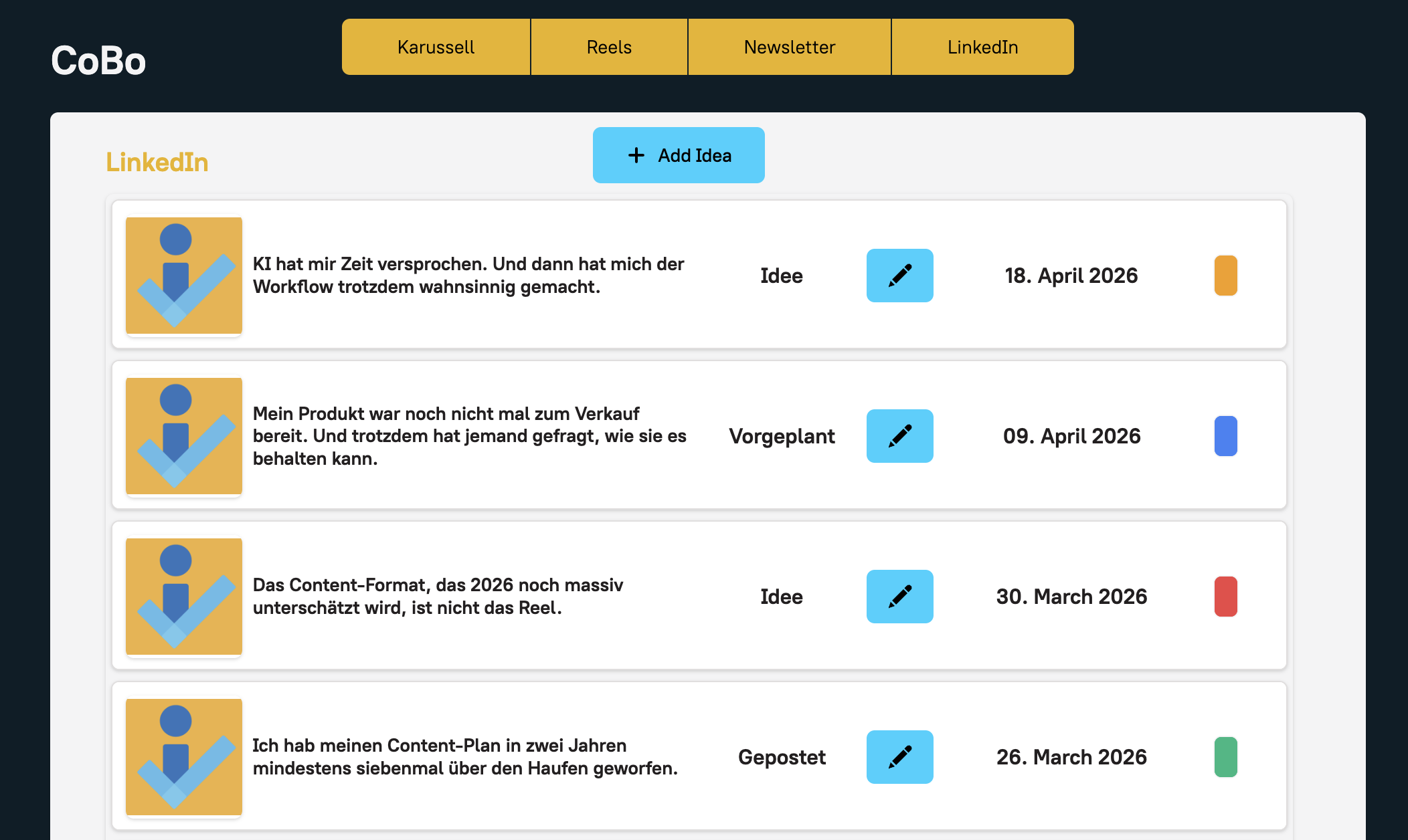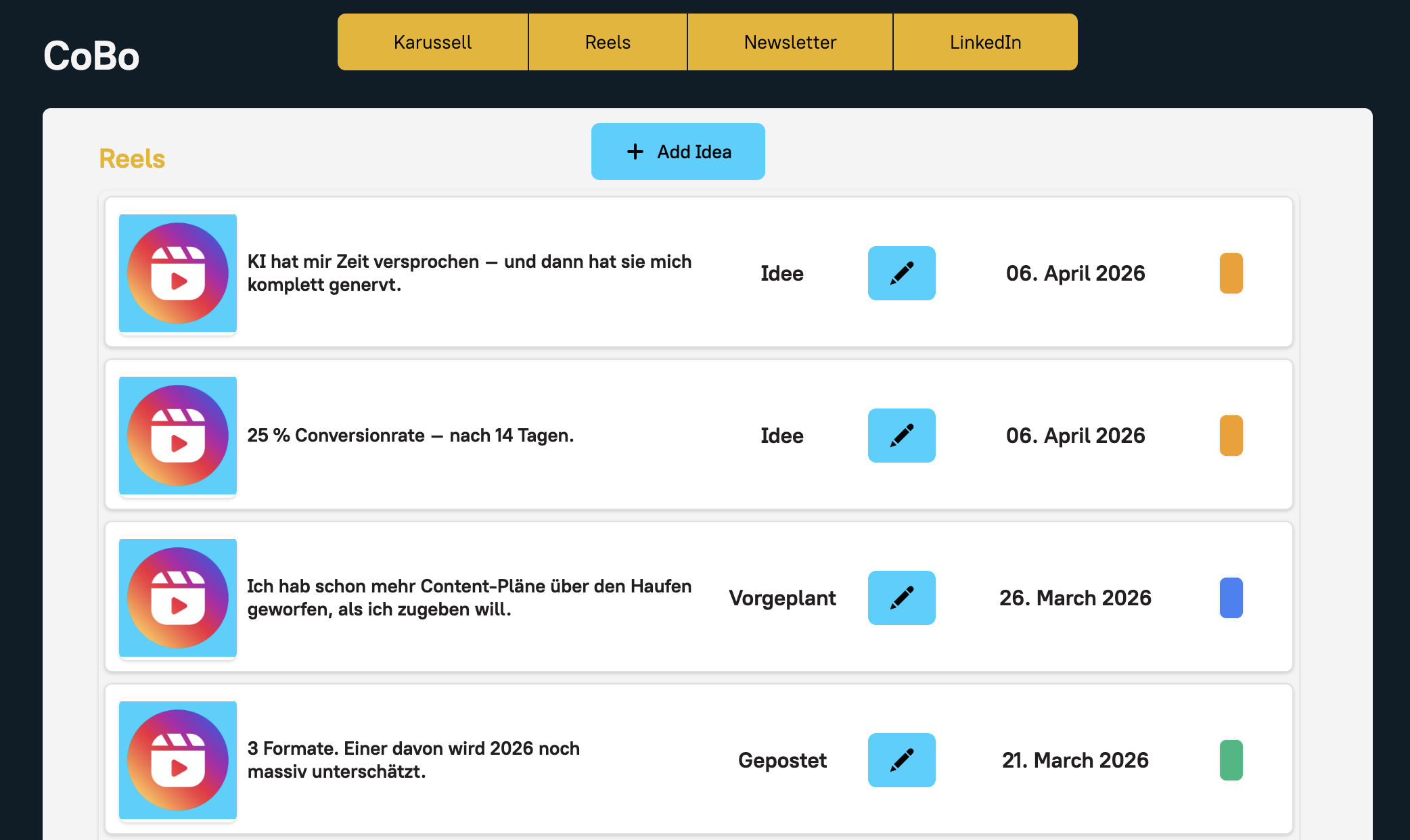 Eine Idee rein und CoBo macht dir daraus Reel, Karussell & Co. fertig im eigenen Contentplan.