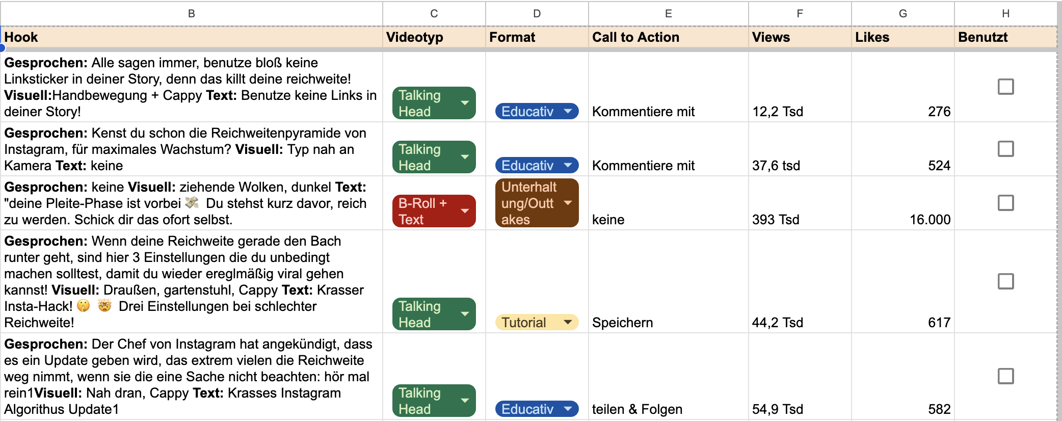 Wie viele Posts kannst du diese Woche schaffen? Zwei? Drei? Fünf? Die Best-Performer-Formate kennst du bereits aus deiner Recherche. Du musst nicht raten, du musst nur auswählen und umsetzen.